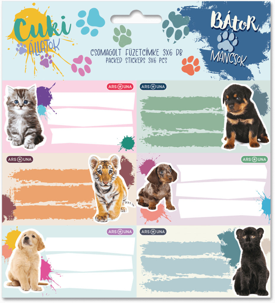 Cuki állatok füzetcímke 18 db, (kutya, cucam tigris, stb.), 2025