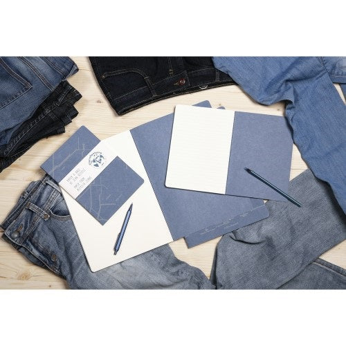 • farmervászon, melyet a füzetborító előállításához használtak, a farmergyártás során megmaradt, kidobásra ítélt anyagokból, illetve használt ruhadarabok felhasználásával készült. Ezáltal ezek a környezetbarát termékek a körforgásos gazdaság részét képezik.