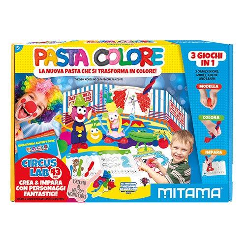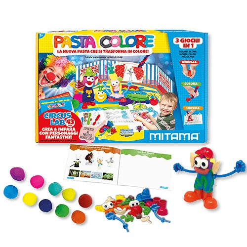 • A szett tartalma: 10 db színes gyurma (10*30g), 26 db kiegészítő, 1 db cirkusz tematikájú alap, 2 db cirkuszsátor, 1 db sodrófa, 1 db kicsi műanyag kés, 1 db tasak kiszáradás ellen, 1 db oktatófüzet (olasz & angol nyelvű)