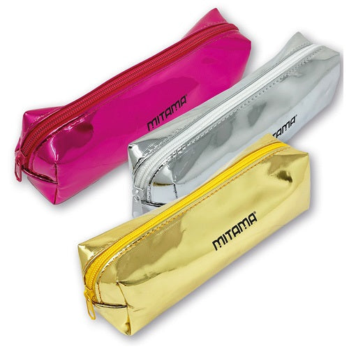 A képen három fényes “Mitama SPECIAL GLAMOUR” tolltartó látható arany, ezüst és rózsaszín színekben; ragyogó árnyalataik vonzó és funkcionális kiegészítővé teszik az írószerek tárolását.