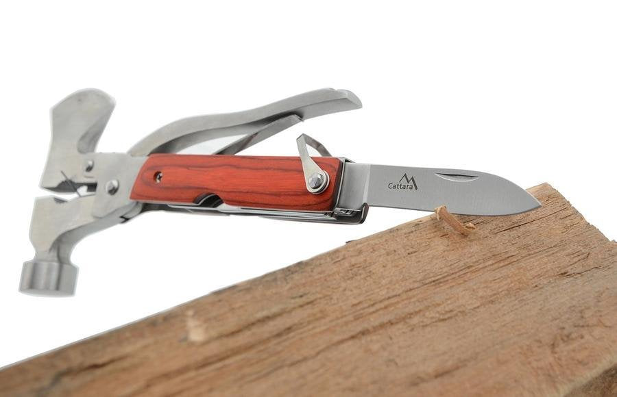 Sietve kell fát vágnia, szöget vernie, vagy éppen kinyitnia egy doboz frissítő italt? A Cattara Multi Hammer multifunkciós kés segít Önnek ezekben a tevékenységekben. Elfér a zsebében, vagy a szövet tokkal az övére erősíthető. A kés összesen 12 szerszámot rejt, amelyeket mindig magánál tarthat, akár otthon, akár horgászat közben, akár kempingezéskor.
