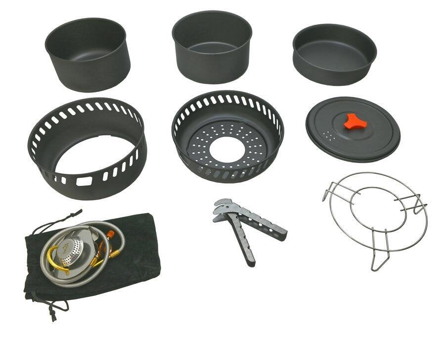 A tűzhelyen kívül egy serpenyőt, két edényt, egy fedőt és egy Grippert is talál a csomagban. A megfogó fogóként az edény szélére akasztható, és praktikus fogantyút hoz létre. A tűzhely kis helyet foglal. Csak hajtsa össze, és csomagolja be utazásaihoz. Az égőt textil tokban kapod, a többi tartozékkal együtt pedig hálózsákban.