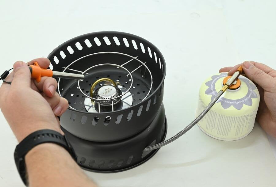 Ezenkívül használhatja ezt az égőt gáz-előmelegítővel még hidegben vagy nagy magasságban is. A praktikus piezo öngyújtó megkönnyíti az égő meggyújtását.