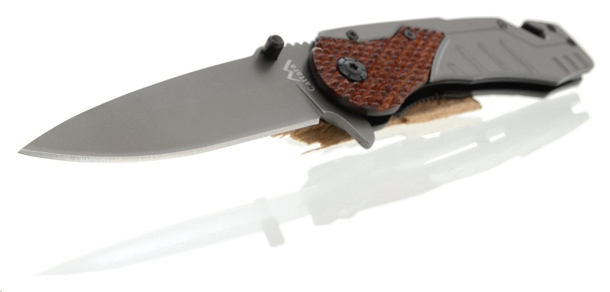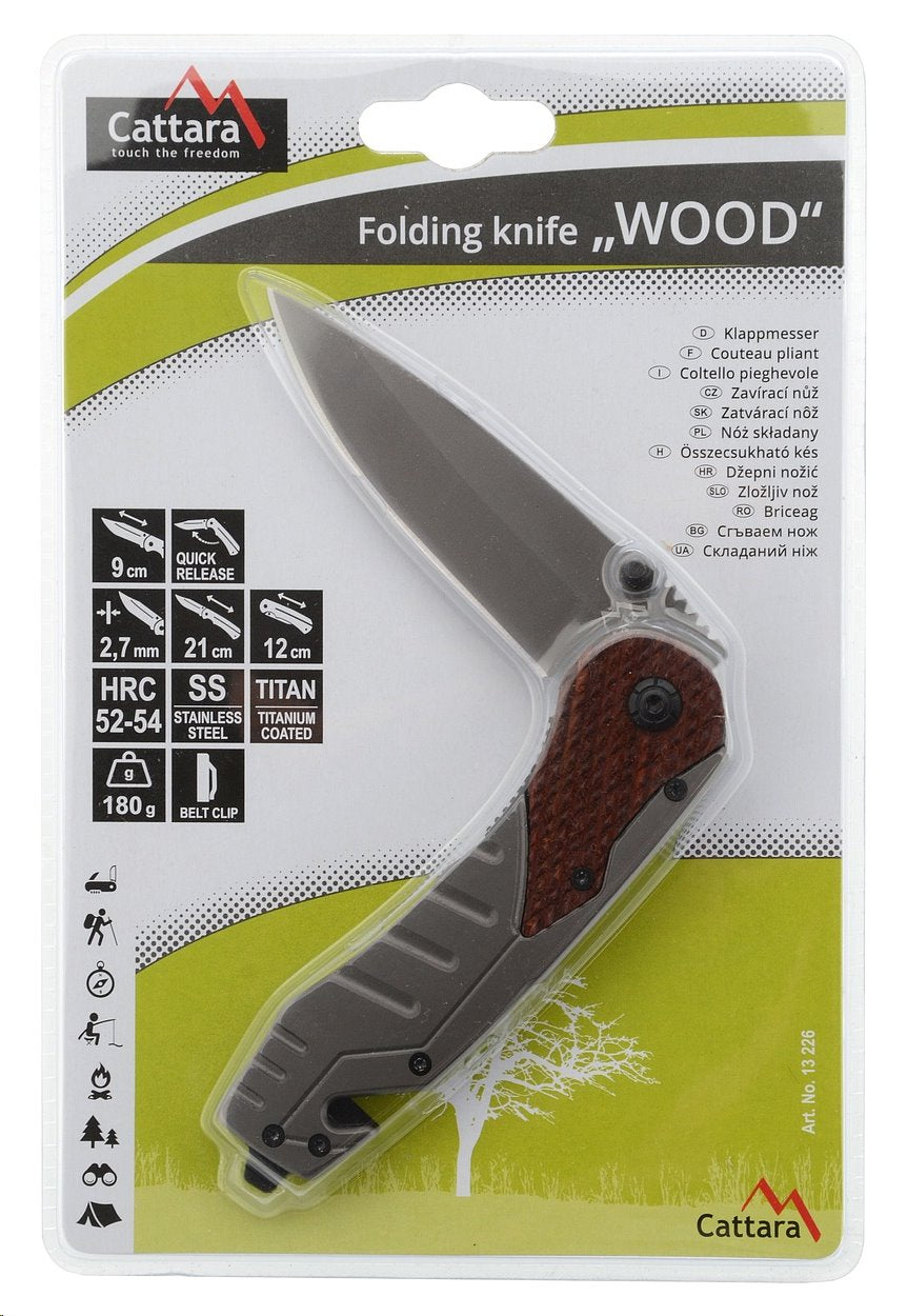 A Cattara Wood 21 cm-es összecsukható zsebkés a kempingezés, a horgászat és a legtöbb szabadtéri tevékenység elengedhetetlen kelléke. A kés pengéje késacél 20J2, 9 cm hosszú és 2,7 mm vastag. Ez a króm, nikkel, mangán, szilícium, foszfor, szén, kén és vas ötvözete kiváló, HRC52-54-es keménységet ér el, és különösen alkalmas a zord környezethez, ahol kiválóan ellenáll a korróziónak és a külső hatásoknak.