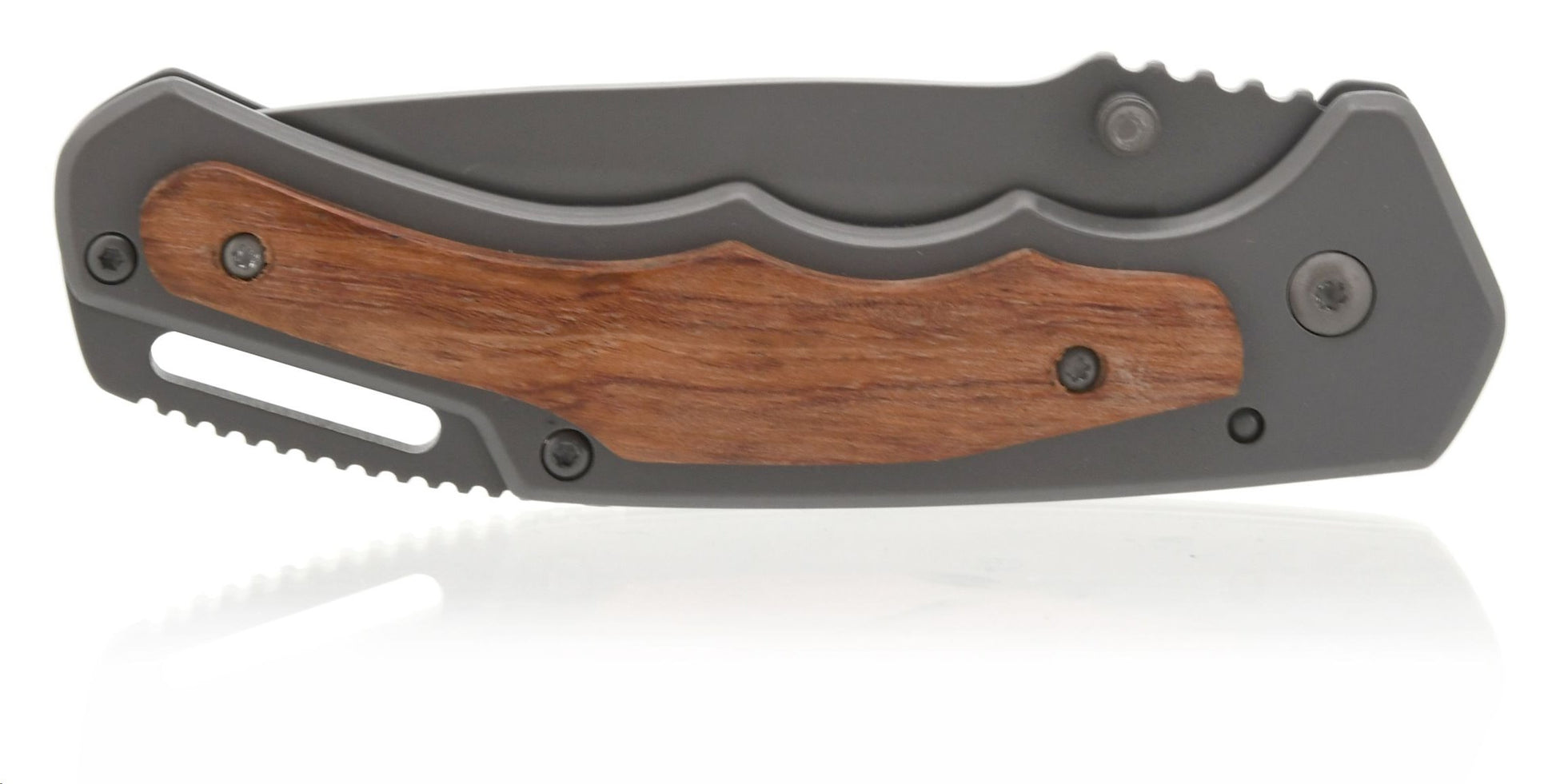A Liner Lock megakadályozza, hogy a penge munka közben véletlenül becsukódjon. A markolatot minőségi fa borítja, rozsdamentes acél fogantyún, titánbevonattal, melynek hátoldalán klipsz található a zseb vagy öv szélére történő rögzítéshez..