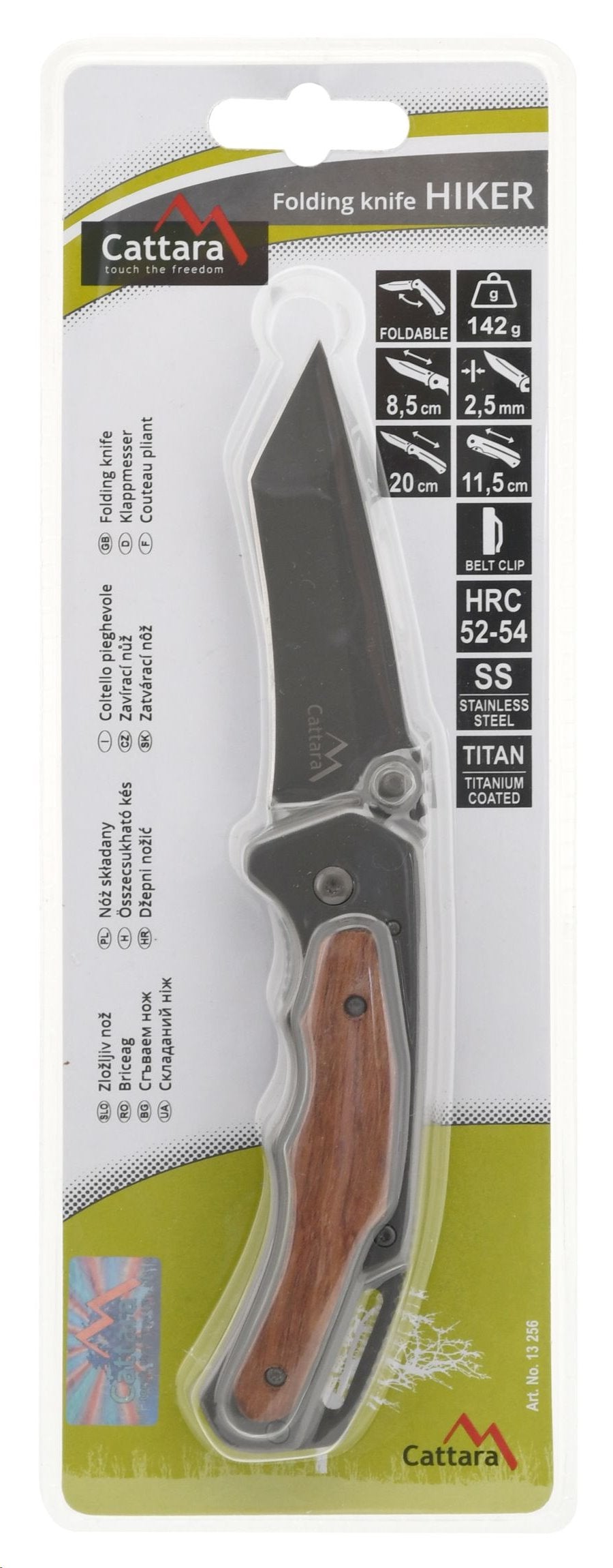 A Cattara Hiker 20 cm-es összecsukható zsebkés a kempingezés, horgászat és a legtöbb szabadtéri tevékenység elengedhetetlen kelléke. A kés pengéje késacél 20J2, 8,5 cm hosszú és 2,5 mm vastag. Ez a króm, nikkel, mangán, szilícium, foszfor, szén, kén és vas ötvözete kiváló HRC52-54-es keménységet ér el, és különösen alkalmas a zord környezethez, ahol kiválóan ellenáll a korróziónak és a külső hatásoknak.