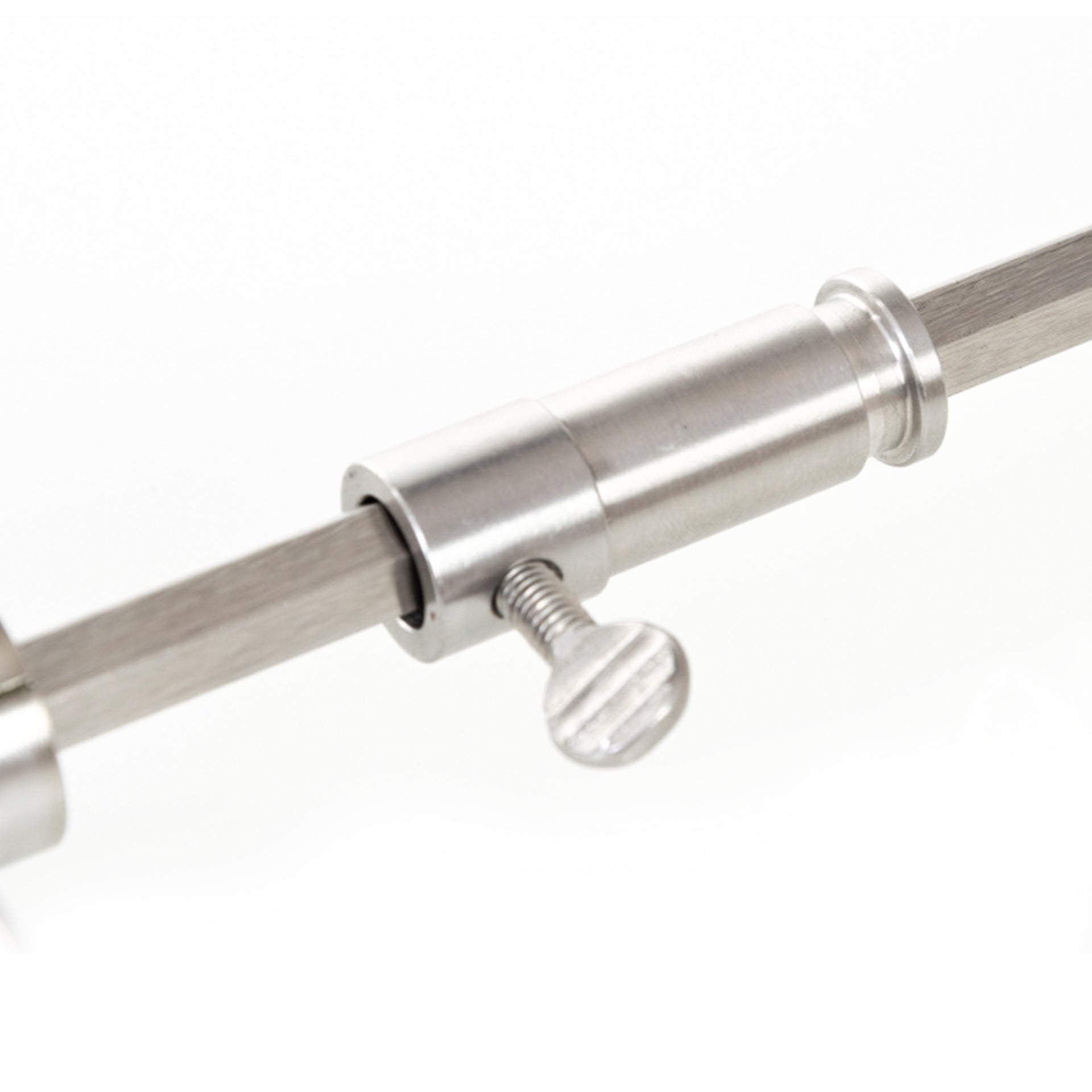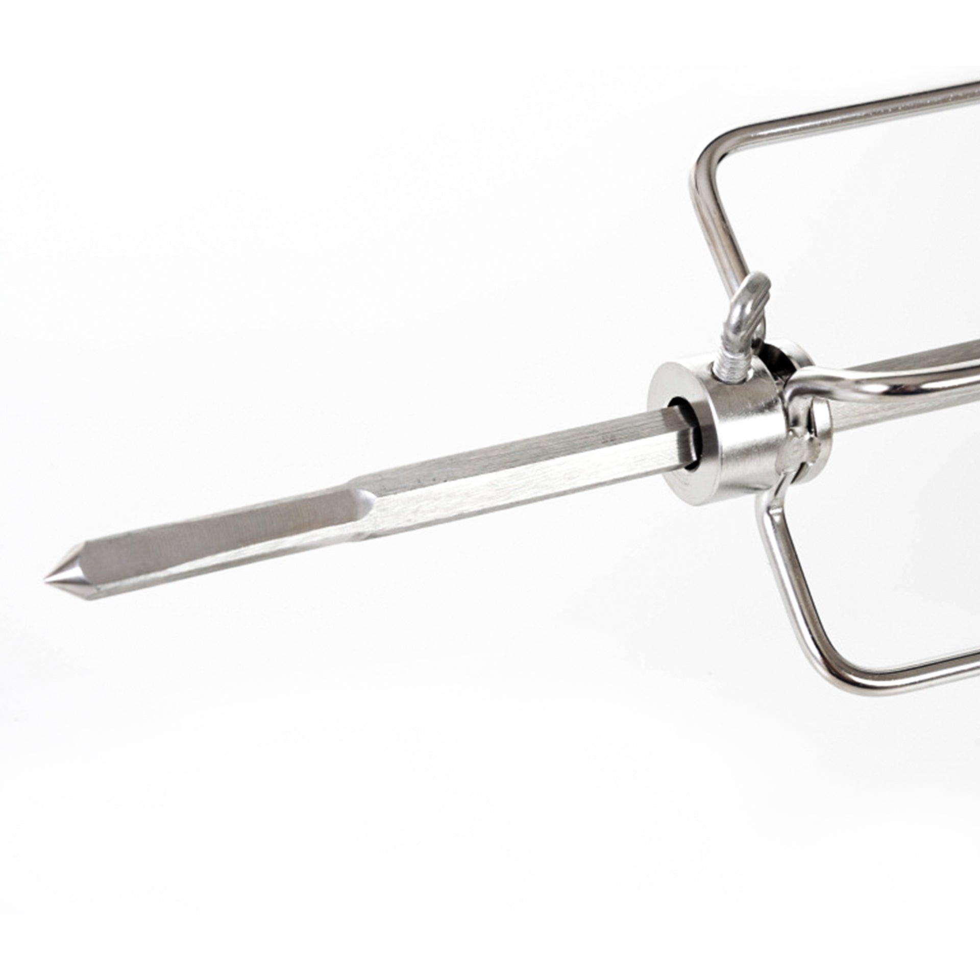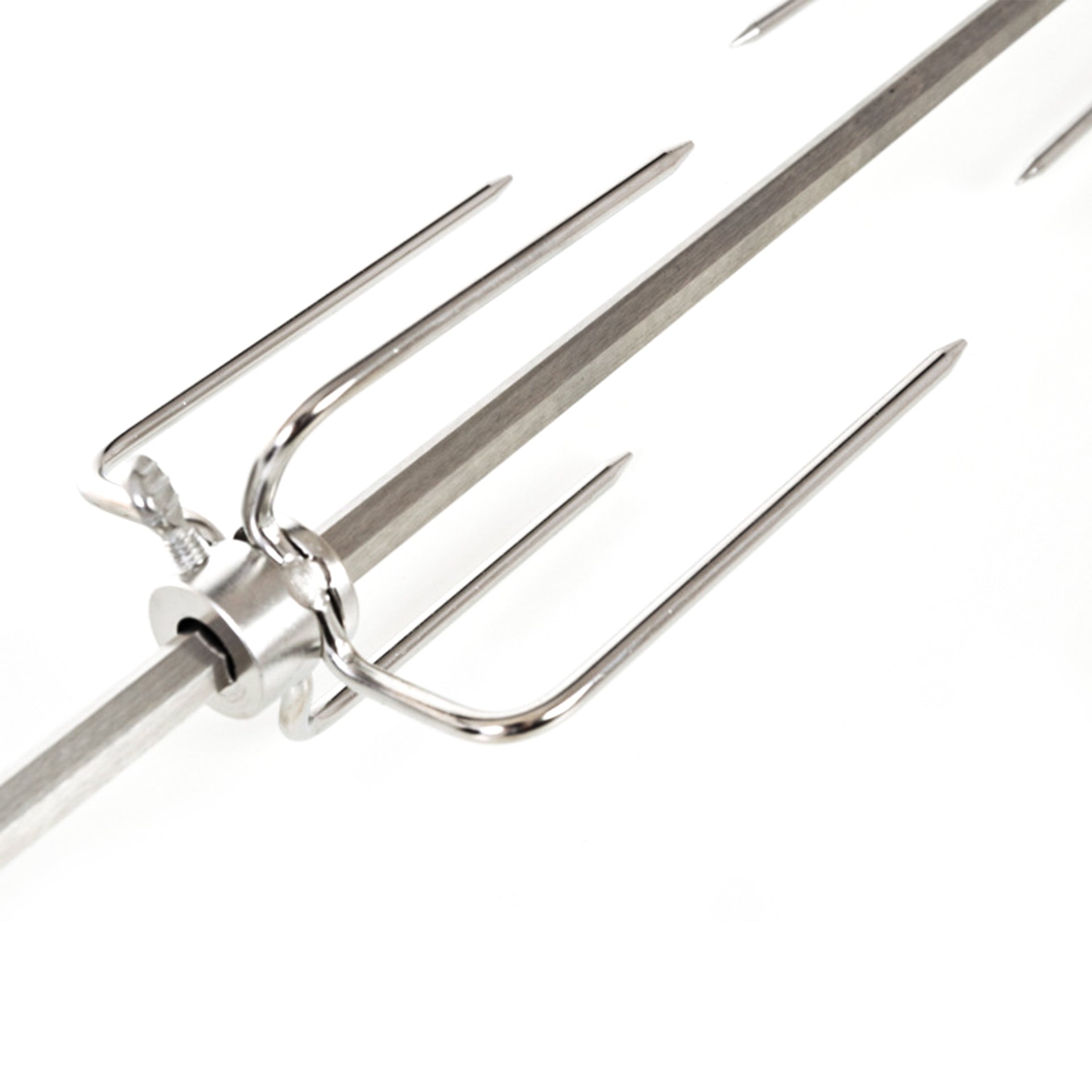 A nyárs rozsdamentes acélból készült, mindkét végén 4 állítható villa található, amelyeket rögzítőcsavarokkal igénye szerint beállíthat.