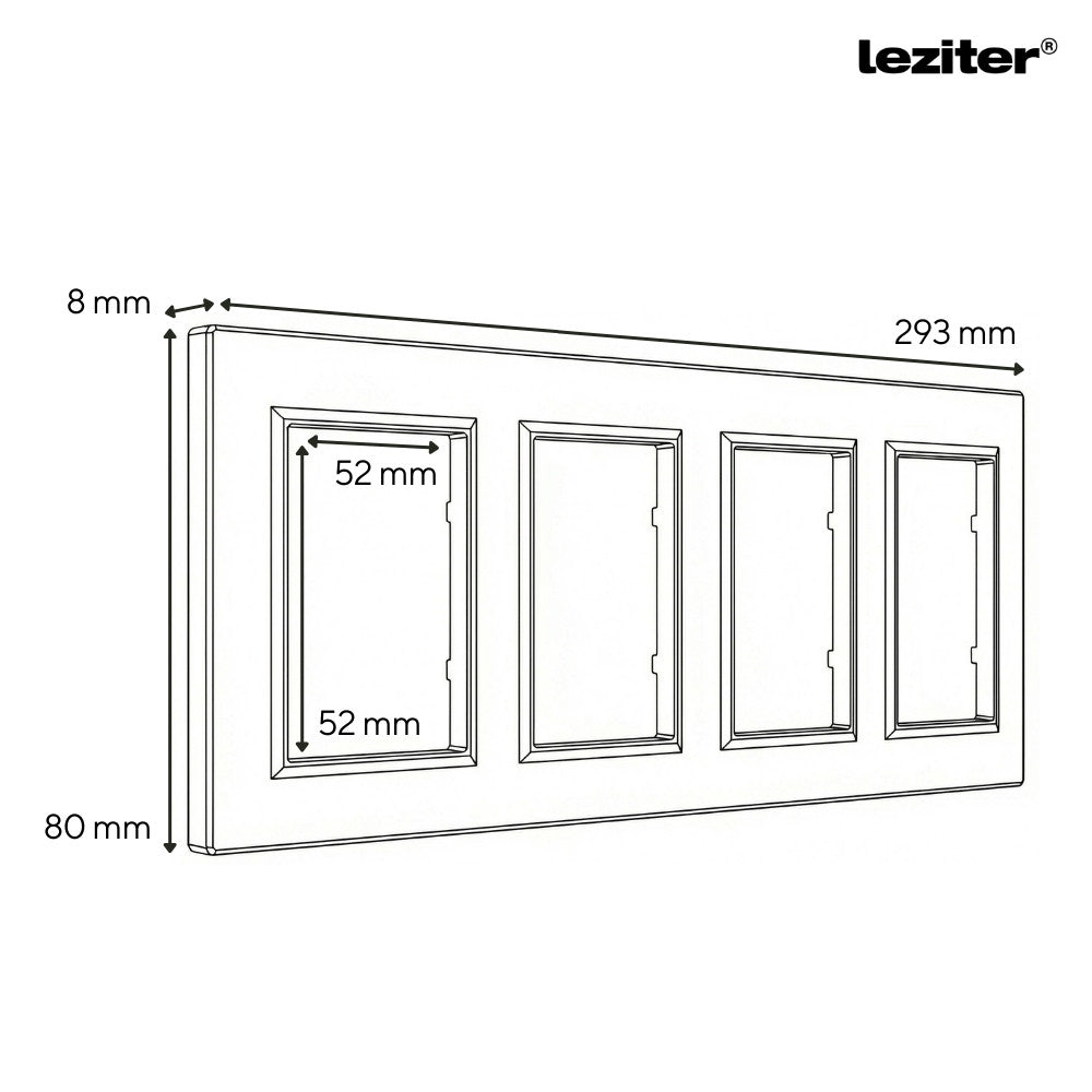 A Leziter Nova négyes keret négy modul (pl. kapcsoló vagy csatlakozóaljzat) esztétikus és stabil fali rögzítésére szolgál, kompatibilis a Nova rendszer keret nélküli szerelvényeivel. A 83 × 300 mm-es, vízszintes elrendezésű, lekerekített peremű, süllyesztett kivitel letisztult megjelenést biztosít, kizárólag száraz, pormentes beltéri környezetben alkalmazható.
