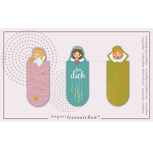 Ez a szett három divatos és életvidám témájú mágneses könyvjelzőt tartalmaz, amelyek tökéletesek a könyvek szerelmeseinek. A könyvjelzők angyalka mintával rendelkeznek: szőke, barna és vörös angyalok.