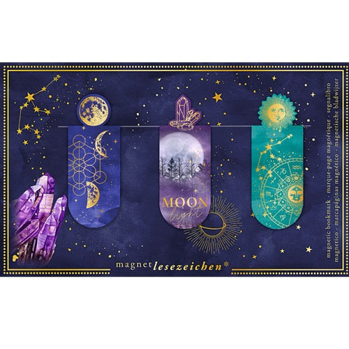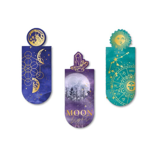 Ez a szett három divatos és életvidám témájú mágneses könyvjelzőt tartalmaz, amelyek tökéletesek a könyvek szerelmeseinek. A könyvjelzők különböző mintákkal díszítettek: az egyik égitesteket és geometriai mintákat ábrázol, a másik egy nyugodt holdfényes tájat kristállyal, a harmadik pedig asztrológiai szimbólumokat és egy napot arcvonásokkal. Az exkluzív arany fólia díszítés csak tovább emeli a termék szépségét és eleganciáját.