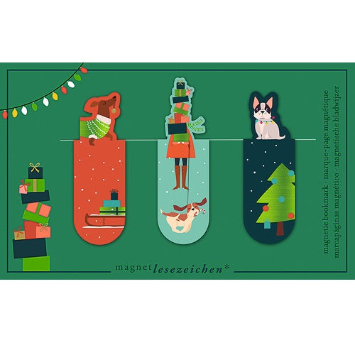 Ez a szett három divatos és életvidám témájú mágneses könyvjelzőt tartalmaz, amelyek tökéletesek a könyvek szerelmeseinek. A könyvjelzők különböző karácsonyi kutyás mintával rendelkeznek: szánnal, ajándékokkal, karácsonyfával.