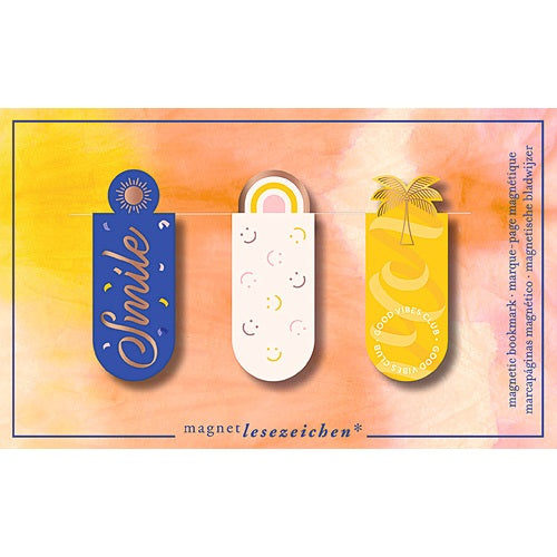 Ez a szett három divatos és életvidám témájú mágneses könyvjelzőt tartalmaz, amelyek tökéletesek a könyvek szerelmeseinek. A könyvjelzők különböző vidám mintákkal díszítettek: az egyik kék alapon “Smile” felirattal, a másik rózsaszín hold és csillagok mintával, a harmadik pedig sárga pálmafás dizájnnal. Ezek a színes és pozitív témájú könyvjelzők feldobják az olvasás élményét.