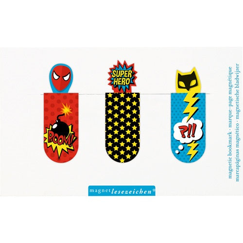 Ez a szett három divatos és életvidám témájú mágneses könyvjelzőt tartalmaz, amelyek tökéletesek a könyvek szerelmeseinek. A könyvjelzők különböző szuperhősös mintákkal díszítettek: az egyik piros háttérrel és Pókember fejével, a másik fekete háttérrel és “SUPER HERO” felirattal, a harmadik pedig kék háttérrel és villámcsapásokkal. Ezek a színes és játékos témájú könyvjelzők feldobják az olvasás élményét.