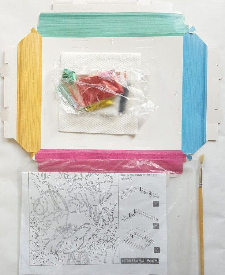 A szett tartalma: öntapadós alaplap, színes csillámporok, ecset, papír keret (kb. 17x13cm), leírás.