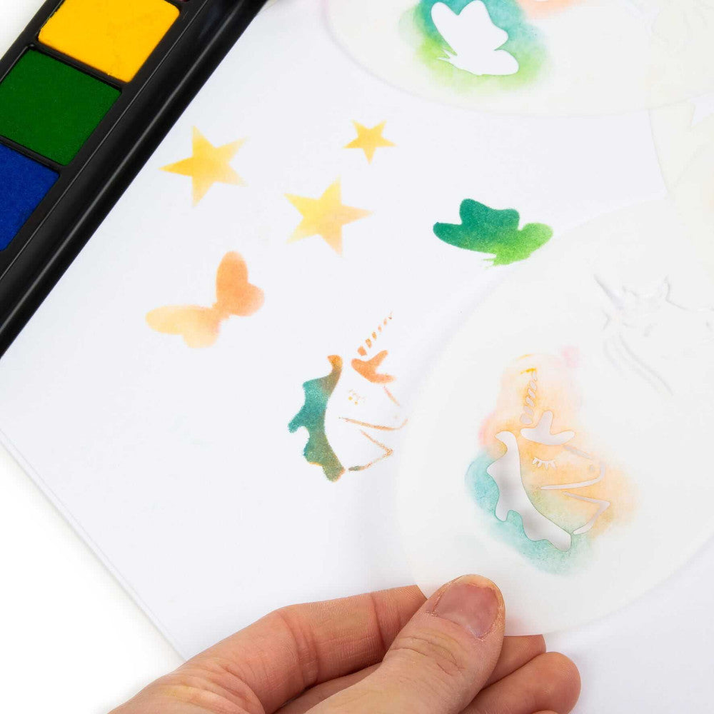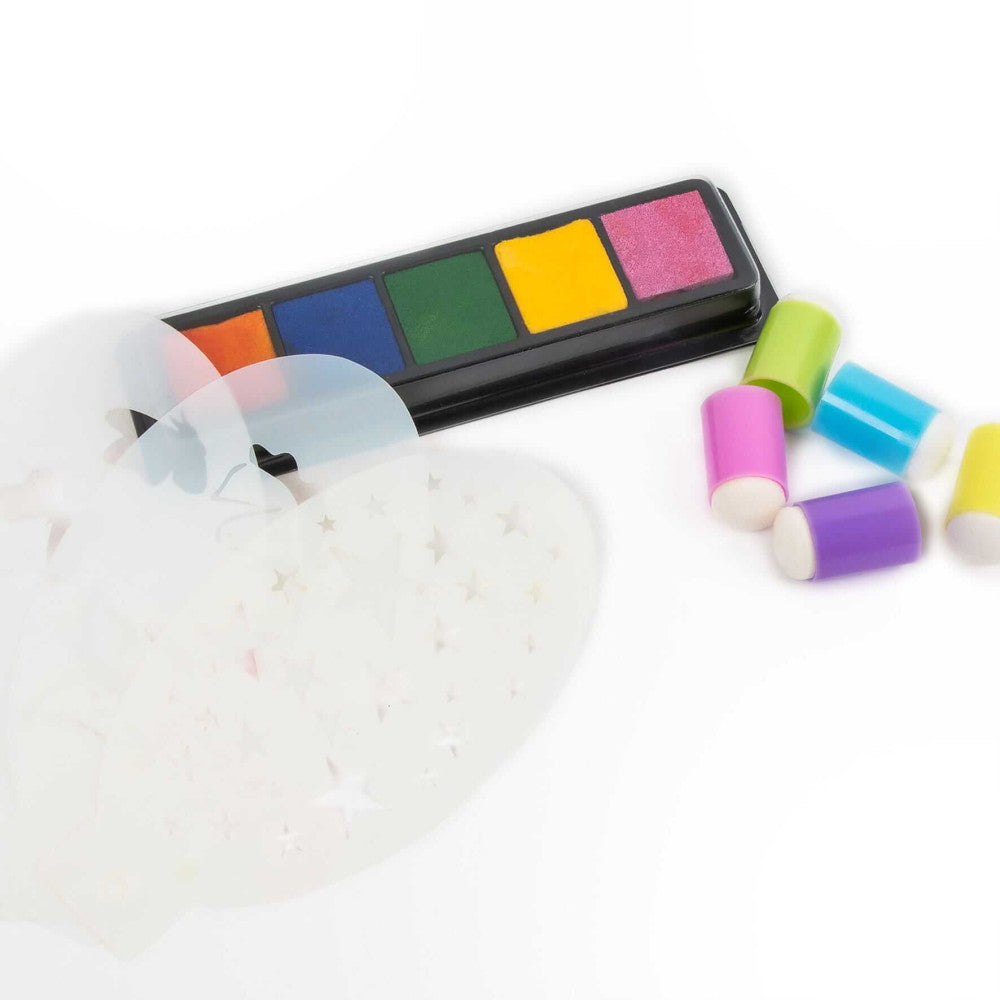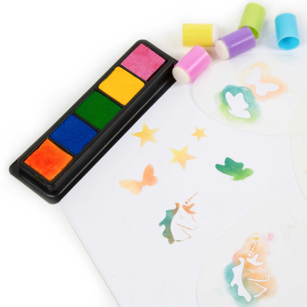 A készlet tartalmaz 5 színű nyomdapárnát, 5 db szivacsot a nyomdázáshoz és sablonokat. A sablonok segítségével különböző formájú mintákat nyomdázhatunk az alkotásainkra. Az applikátor szivacsok segítségével a színek keverhetők és árnyékolhatók egymással.