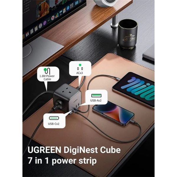 7 az 1-ben elosztó 3 hálózati aljzattal, 2 USB-C, 2 USB-A csatlakozóval, 1,8 m-es hosszabbító kábellel, gyorstöltéssel MacBook, iPad, iPhone 14 stb. készülékekhez