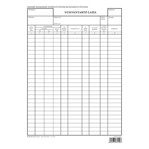 Szigorú számadású nyomtatványok munkahelyi (tételes) nyilvántartó lapja A/4 álló