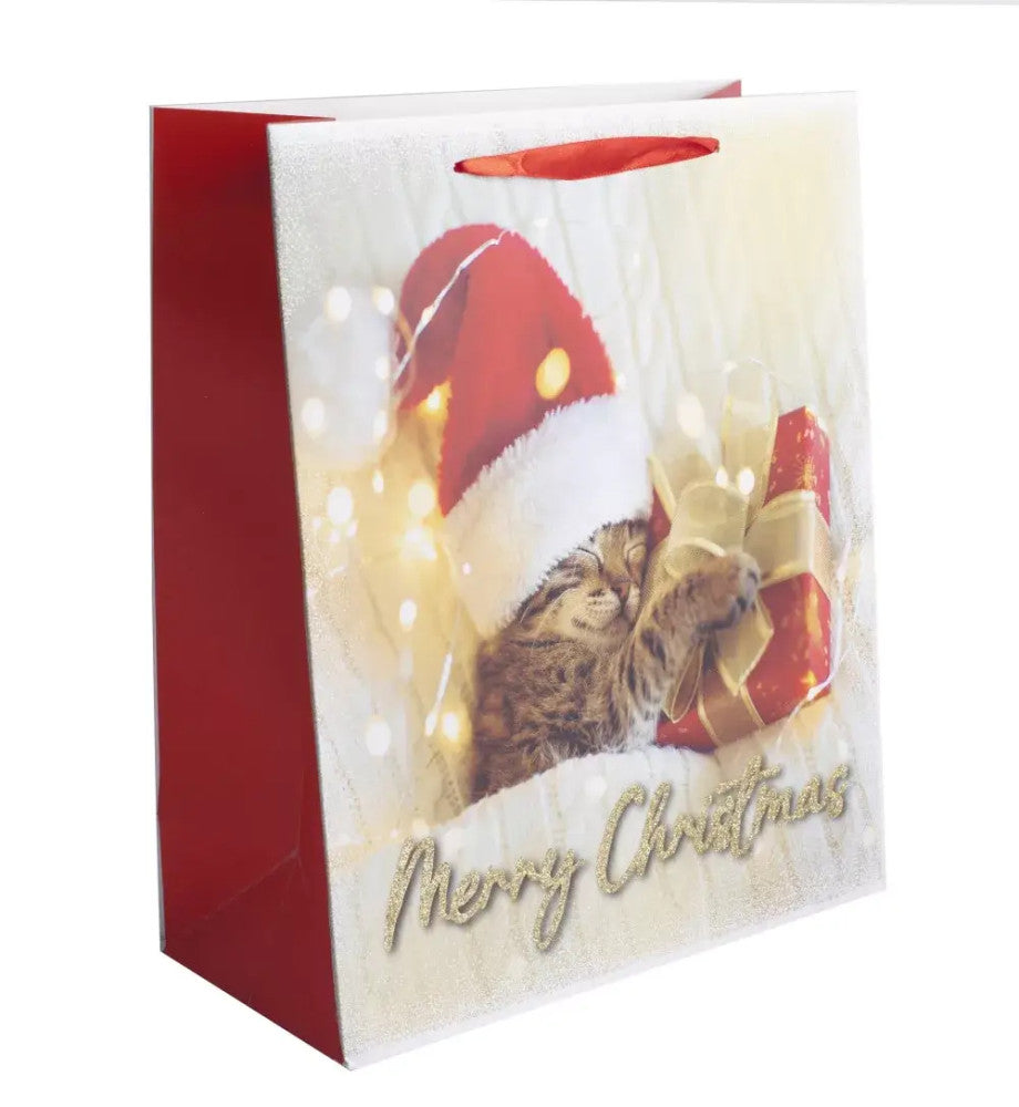 Karácsonyi ajándéktáska 32x26x12cm, nagy, glitteres, cica ajándékkal, Merry Christmas felirattal