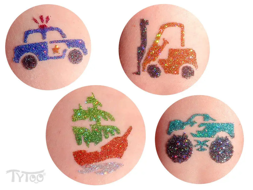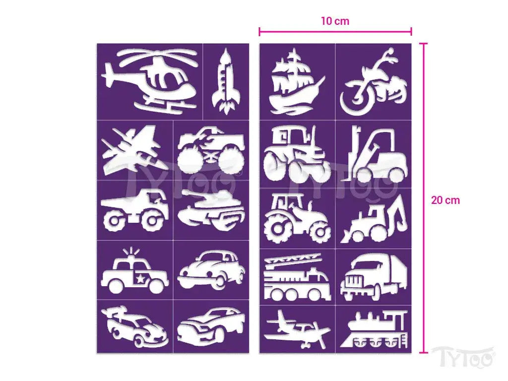 Sablonok, Vehicles, Járművek sablon szett Autók, motorok, vonatok, hajók– minden, ami gurul, zúg vagy száguld, egy szettbe gyűjtve. Ez a sablonválogatás a kis járműrajongók álma, akik festés közben is csak a következő versenyre vagy utazásra készülnek. A csomagban legalább 20 különböző minta található, két nagy méretű íven (10cm x 20cm) elrendezve, így garantált a hosszú távú kreatív szórakozás. A sablonok két rétegűek, nem kell kivágni őket: egyszerűen csak le kell húzni az ívről, rásimítani a bőrre, és már indulhat is a festés vagy csillámporozás! Egyszer használatos sablonok, de elég strapabírók ahhoz, hogy gyerekkezek között se szakadjanak el könnyen Könnyen eltávolíthatók, nem hagynak nyomot a bőrön Használható szülinapokon, kézműves foglalkozáson vagy egy tavaszi délután kreatív kikapcsolódásként