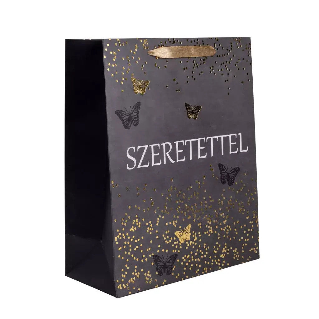 Ajándéktáska 23x18x10cm, közepes, Szeretettel felirattal, fekete, lepkés