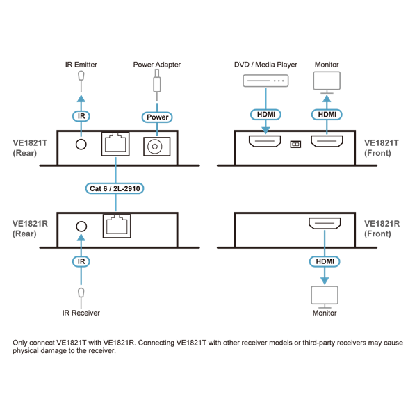 PoC (Power over Cable) technológia – a tápegységet Cat 5e / 6 kábelen keresztül lehet továbbítani az adóról a vevőre, így nincs szükség egy terjedelmes külső tápegységre. Gyártó: ATEN