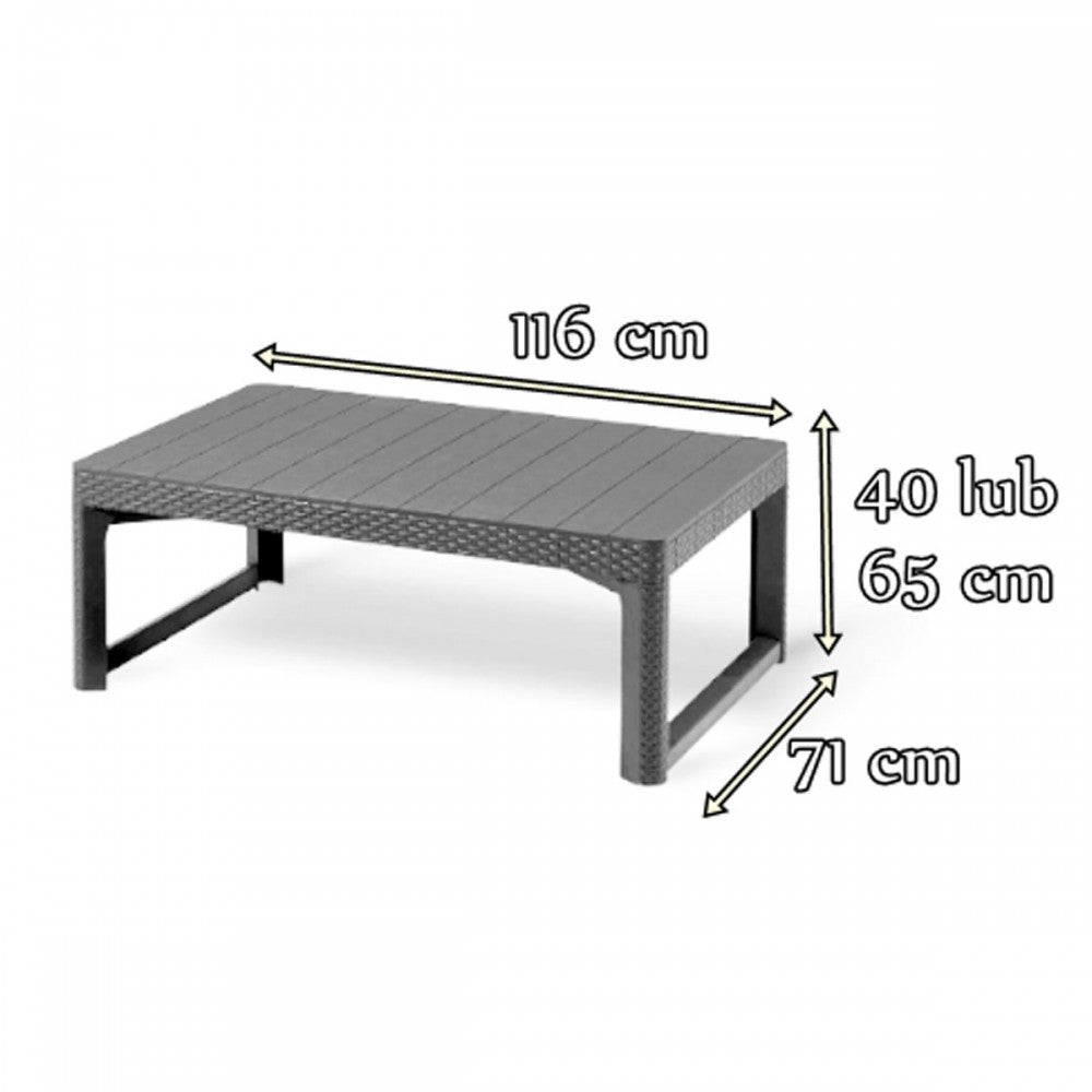 A Lyon asztallapja sík, amely megkönnyíti a poharak,tányérok elhelyezését. Az asztal szabadon állhat anélkül, hogy aggódnia kéne a miatt, hogy napfénynek kitéve elveszíti eredeti színét. Alkalmas Keter, Allibert és Curver székekhez. Összecsukható lábakkal rendelkezik, ami helyet takarít meg tárolás közben.