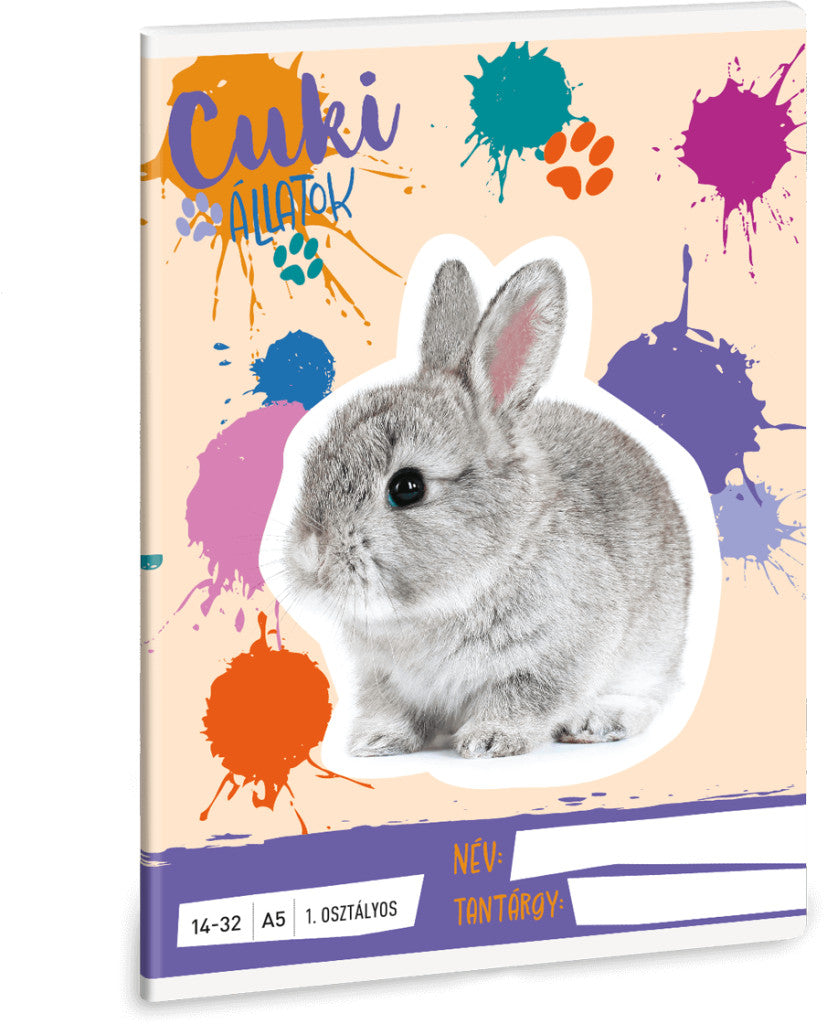 Cuki állatok tűzött füzet A/5, 32 lap vonalas 1.osztály (14-32), nyuszi, 2025