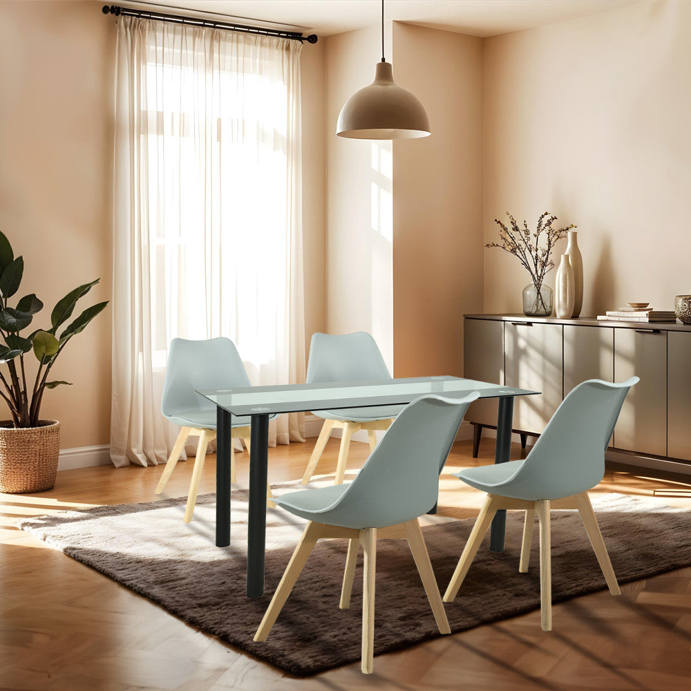 Anyag Edzett üveg asztallap, acél váz szürke PP ülőfelület, szürke PVC párnázat, bükkfa színű lábak