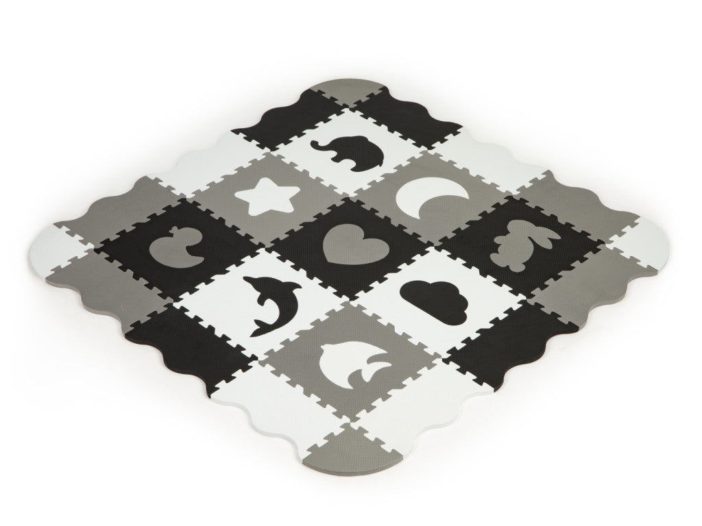 • A készlet **9 négyzetből és **16 további oldalsó elemből** áll. elemek. Az élek különleges „fogakkal” rendelkeznek, amelyeknek köszönhetően bármilyen módon kombinálhatók. A **szőnyeg** vastagsága (1,4 cm)** megfelelő védelmet nyújt esés esetén, és kellemesen puhává teszi.