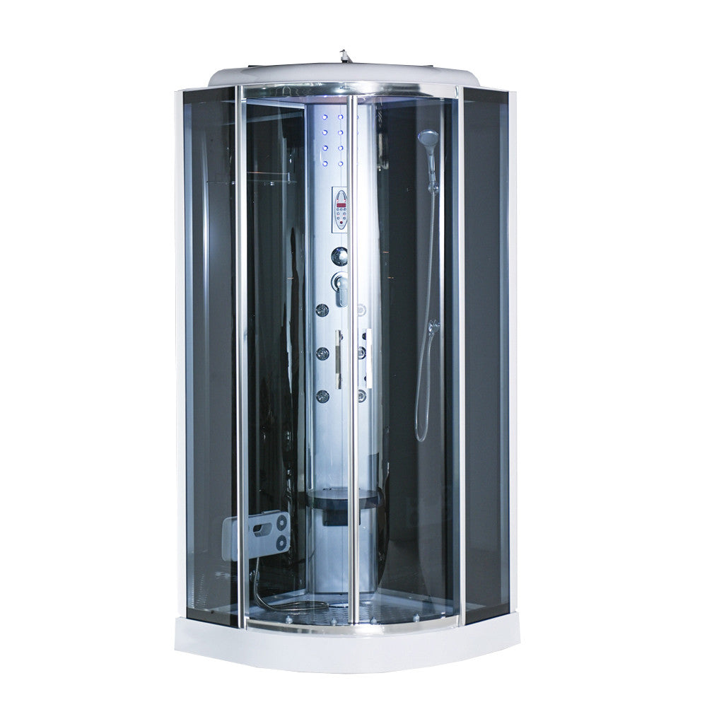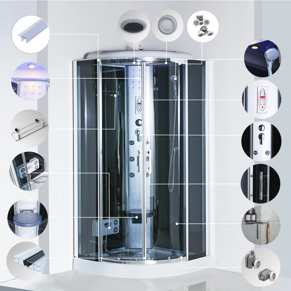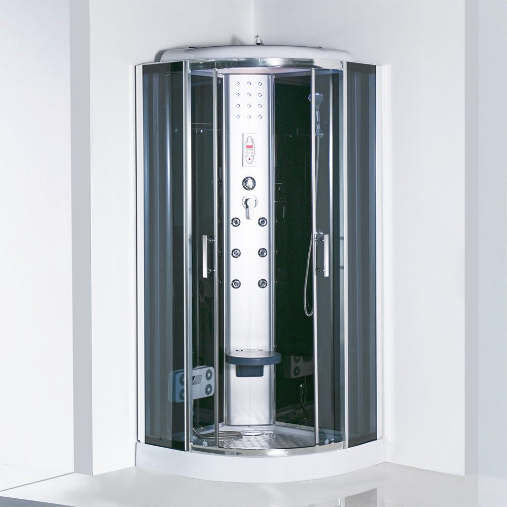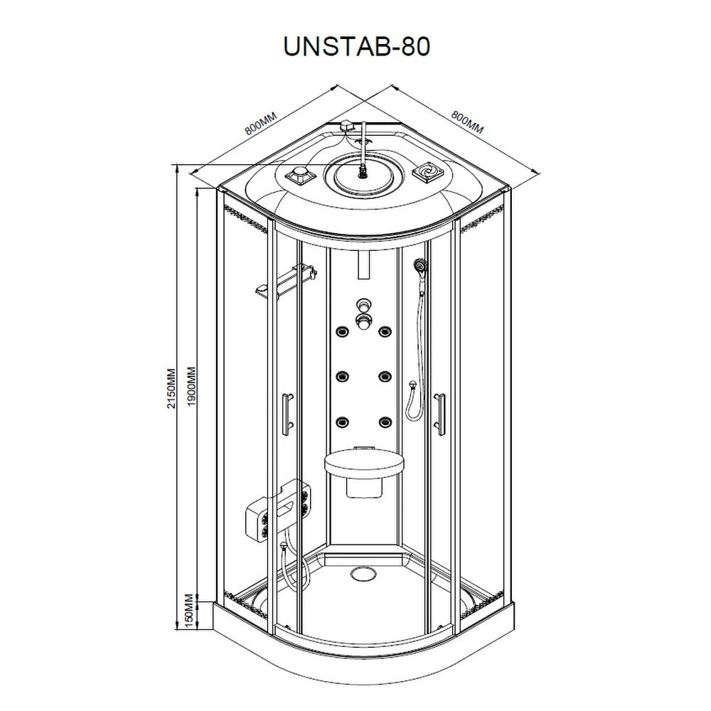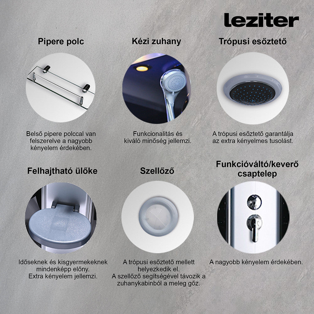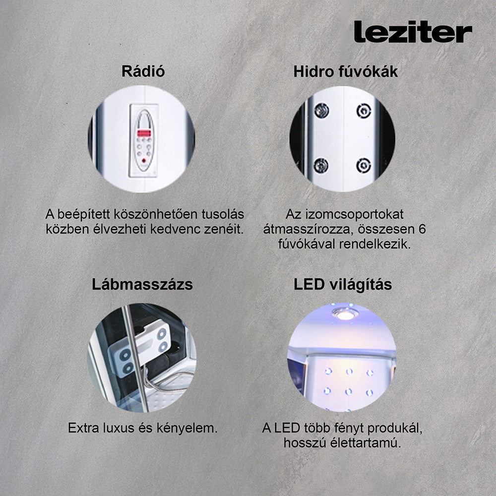 A zuhanykabin 6 hátmasszírozó fúvókával van felszerelve. Az alumínium hátsó panel és a beépített elektronika, kezelőpanel, rádió és hangszórók lehetővé teszik, hogy minden zuhanyzás egy igazi élménnyé váljon. A hátsó és felső hangulatvilágítás, valamint a felső világítás tovább fokozza a relaxációt, miközben a praktikus piperepolc és a lábmasszírozó gondoskodik a maximális kényelemről.