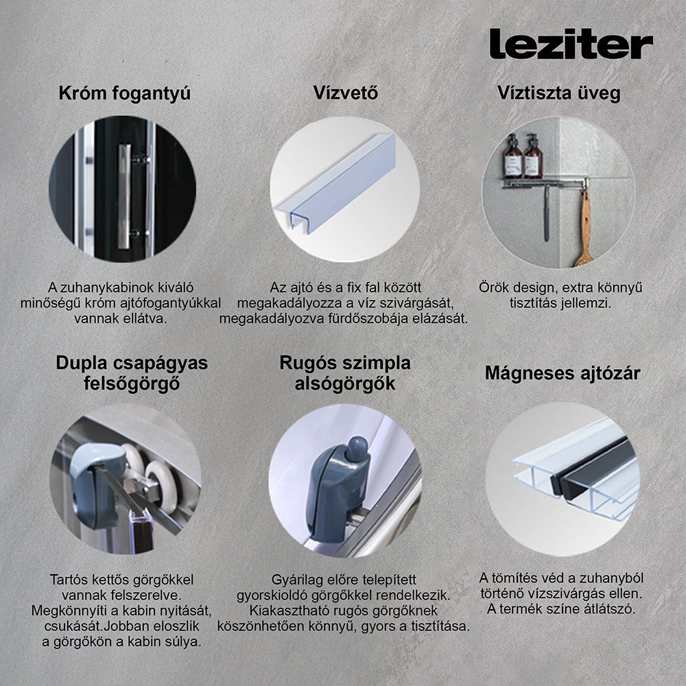 A Vital Black hidromasszázs zuhanykabin modelljei rendkívül sima és tartós kettős görgőkkel vannak felszerelve, mely nagymértékben megkönnyítik a zuhanykabin nyitását és csukását. A terhelés egyenletes elosztása érdekében minden ajtó két ponton gördül, ami nem csak a kiegyensúlyozott működést garantálja, de a szerkezet élettartamát is meghosszabbítja.