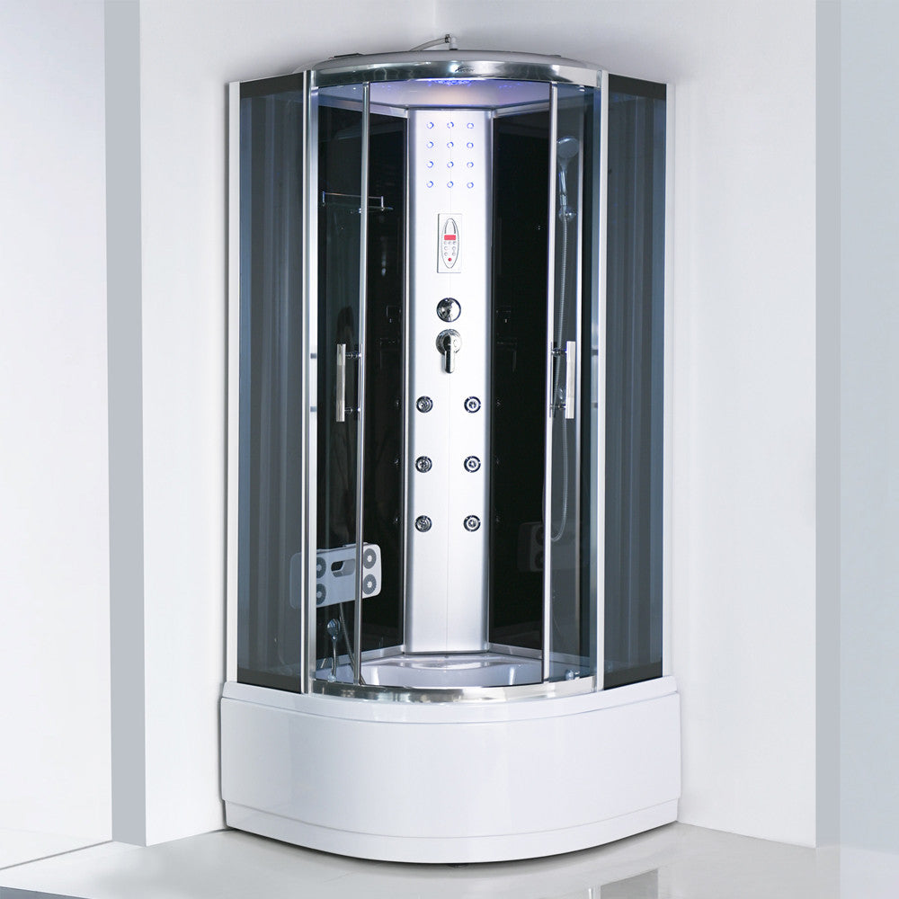A Vital Black hidromasszázs zuhanykabin modern kinézete végett bármely fürdőszobába remekül mutat. Erősített profilokkal van ellátva a hosszabb élettartalom miatt. Matt krom profil található alul és fölül is. 6 hátmasszírozó fúvóka, alu hátsó panel,elektronika, kezelőpanel, rádió, hangszóró, hátsó és felső hangulatvilágítás, felső világítás, pipere polc és a lábmasszírozó biztosítja a kényelmet. 2 zuhanyfej: esőztető fejzuhany, kézi zuhany. Keverő csaptelep, funkcióválasztó kar.