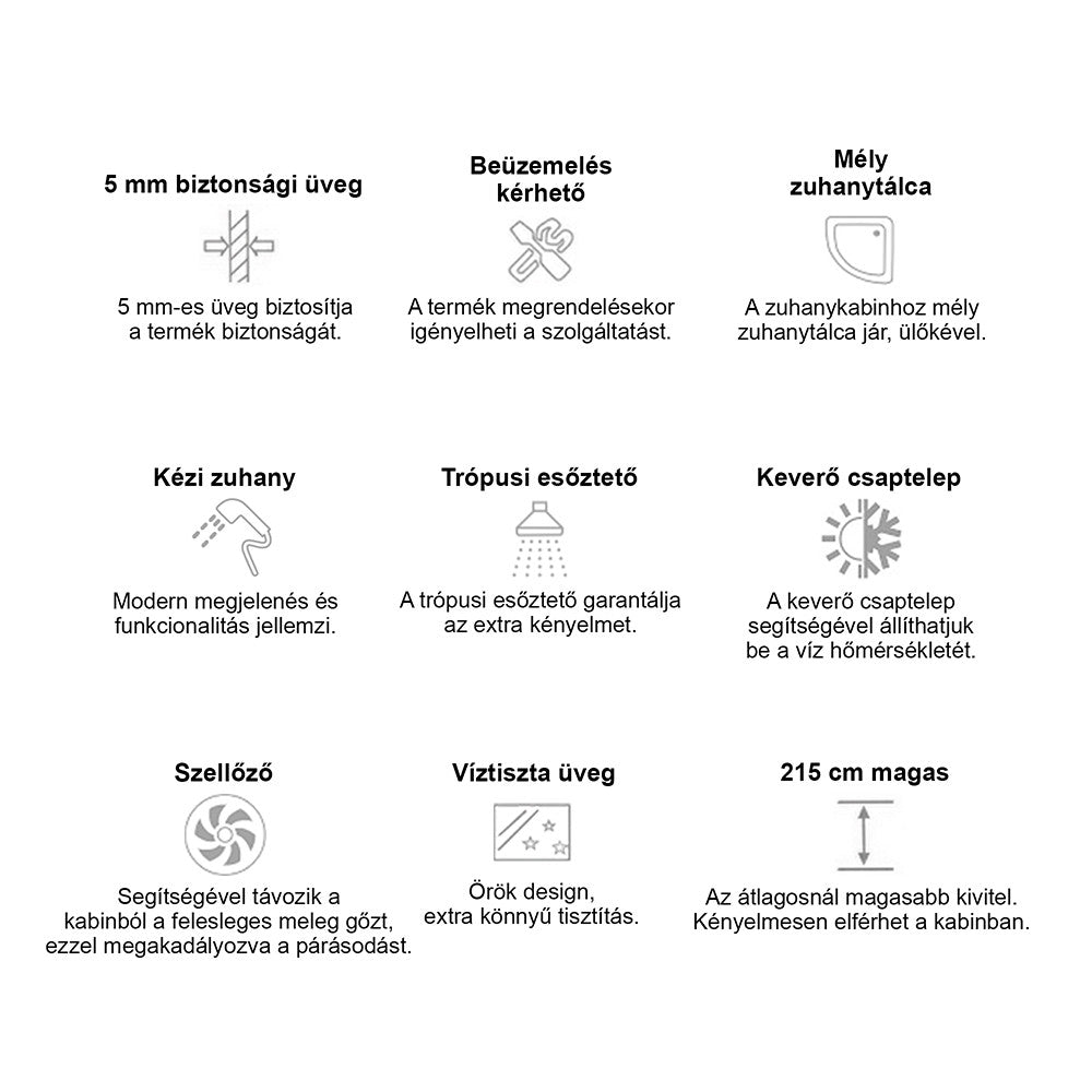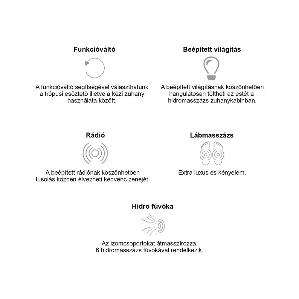 Zuhanykabin kényelmét fokozó eszközök: 6 hátmasszírozó fúvóka, alu hátsó panel, 2 zuhanyfej: esőztető fejzuhany, kézi zuhany, keverő csaptelep, funkcióválasztó kar, elektronika, kezelőpanel, rádió, hangszóró, hátsó és felső hangulatvilágítás, felső világítás, pipere polc, lábmasszírozó, ülőke.
