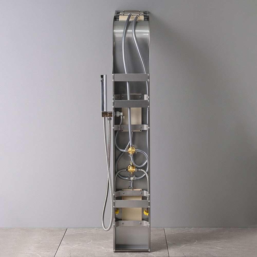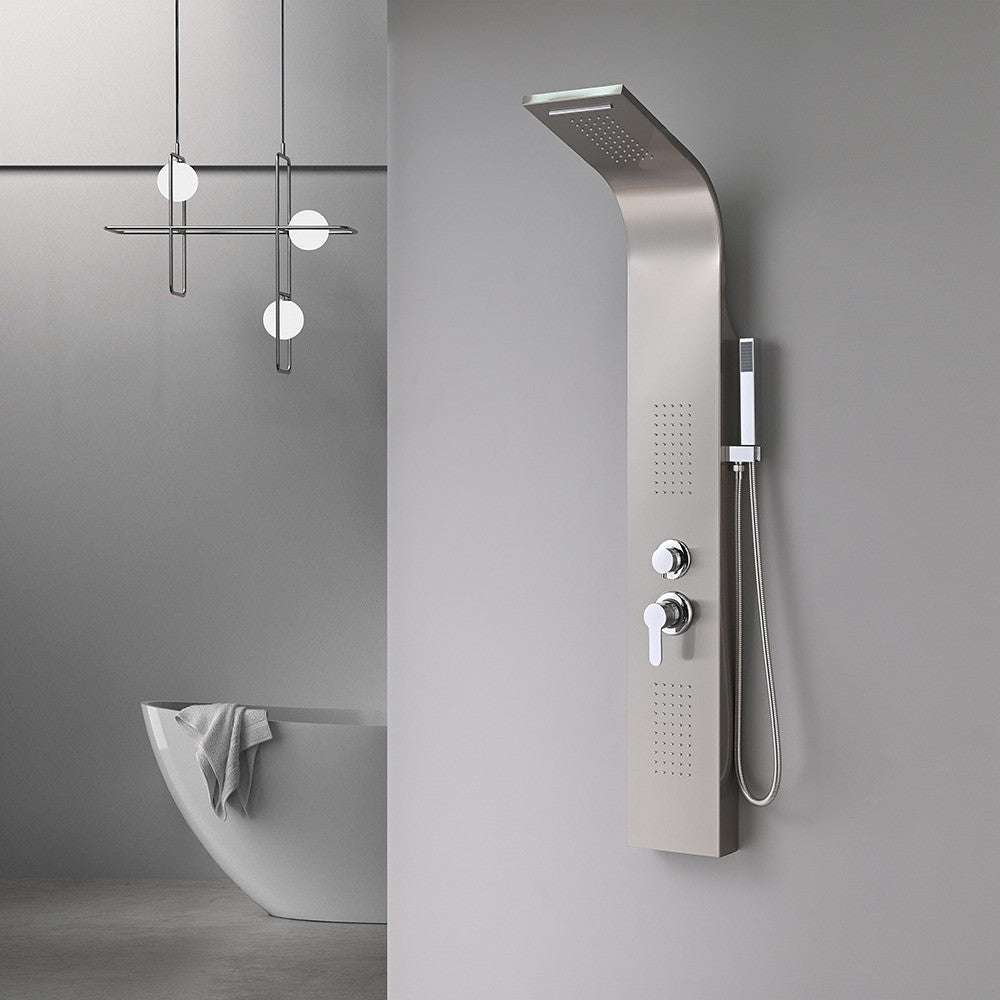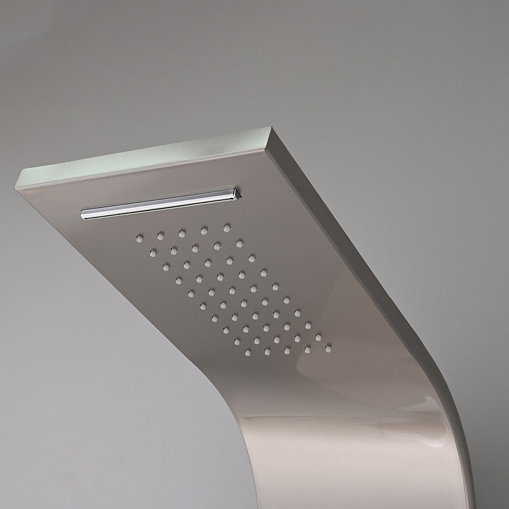 A fő vonzerő a zuhanypanelen található felső zuhany, amely egy vízesés funkciót is magában foglal. Ez a kombináció lehetővé teszi, hogy az ember úgy érezze, mintha egy frissítő vízesés alatt állna, miközben a langyos vízcseppek lágyan simulnak a bőrre, ellazítva az izmokat és megnyugtatva az elmét. A hidromasszázs élményt tovább fokozzák a két hátsó zuhanyfúvóka. Ezek az állítható fúvókák a hát középső részére irányítják a vízsugarat, masszírozza és ellazítja az izmokat, csökkentve a fáradtságot és a stresszt. A hátsó zuhanyfúvókák használata különösen jótékony hatású lehet hosszú nap után vagy intenzív fizikai aktivitás után.