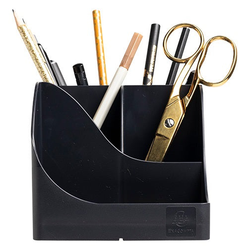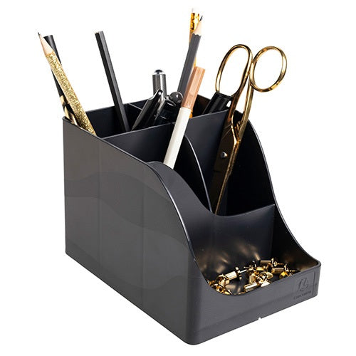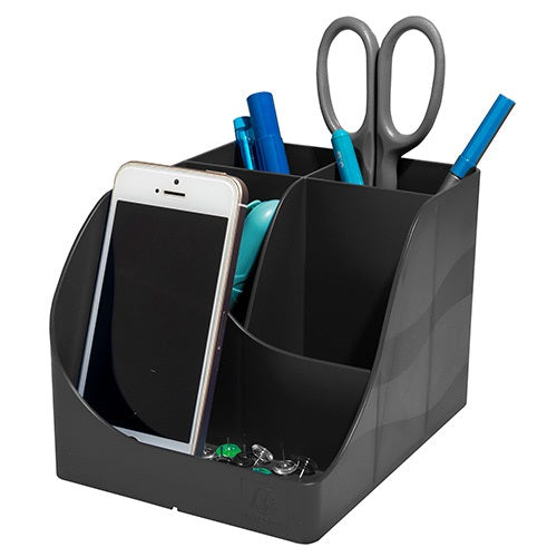 - Négy magas rekeszt kínál nagyobb eszközöknek, mint az ollók és tollak, valamint egy alacsony rekeszt kisebb tárgyaknak, mint például a gemkapcsok, rajzszögek vagy akár mobiltelefon.
