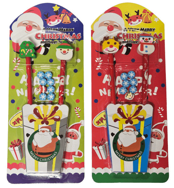 Karácsonyi grafitceruza forma radírral és mini radírokkal, 2 db ceruza és 7 db radír/szett, többféle változat