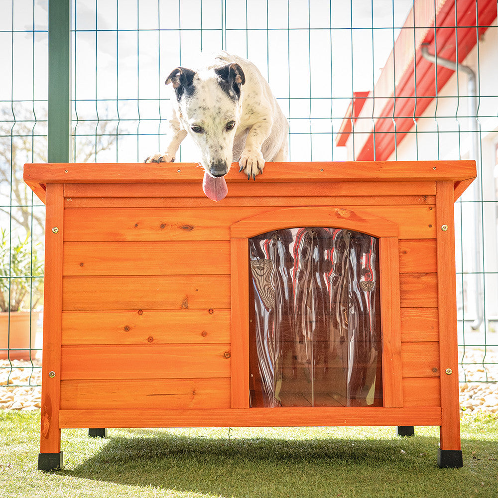 A lapostetős kivitel különösen előnyös szűkebb helyeken, ahol fontos a helytakarékos elhelyezés. A tetőt homokszórt bitumenes kátránypapír borítja, amely megbízható védelmet nyújt eső és nedvesség ellen. A lamellás műanyag ajtó csökkenti a huzatot, távol tartja a szelet és a csapadékot, miközben könnyű ki- és bejutást biztosít a kutyának.