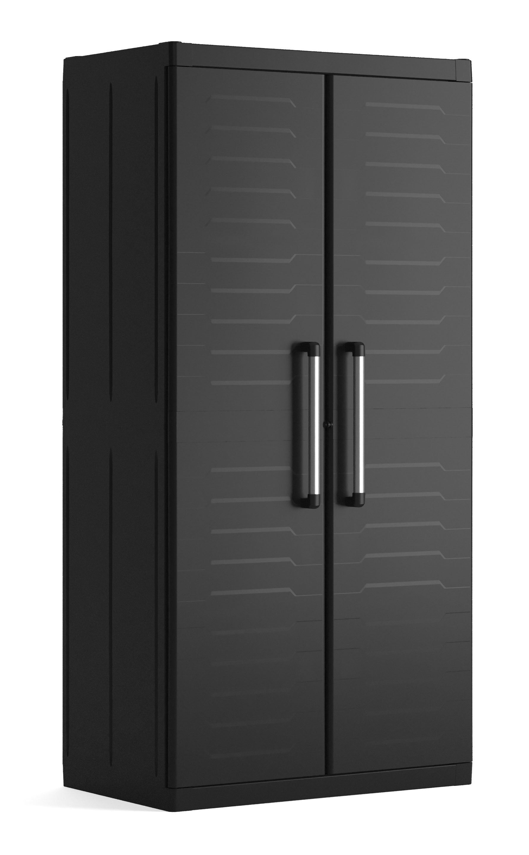 A szekrény 4 hozzáadott polccal rendelkezik - mindegyik 25 kg teherbírással, amelyek jól jönnek a nehezebb tárgyakra. Használhatószerszámok vagy kerti kellékek tárolására, jól jön hosszú nyelű szerszámokra, amelyek máshova nem férnének be. Az univerzális fekete színének köszönhetően beleillik minden térbe függetlenül a berendezés stílusától.