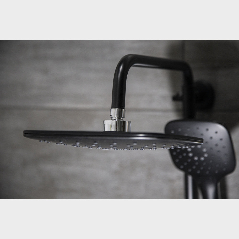 Zuhanykészlet termosztatikus csappal és esőzuhannyal, félig matt fekete színben, amely egyre gyakrabban választott szín a fürdőszobák elrendezése során.