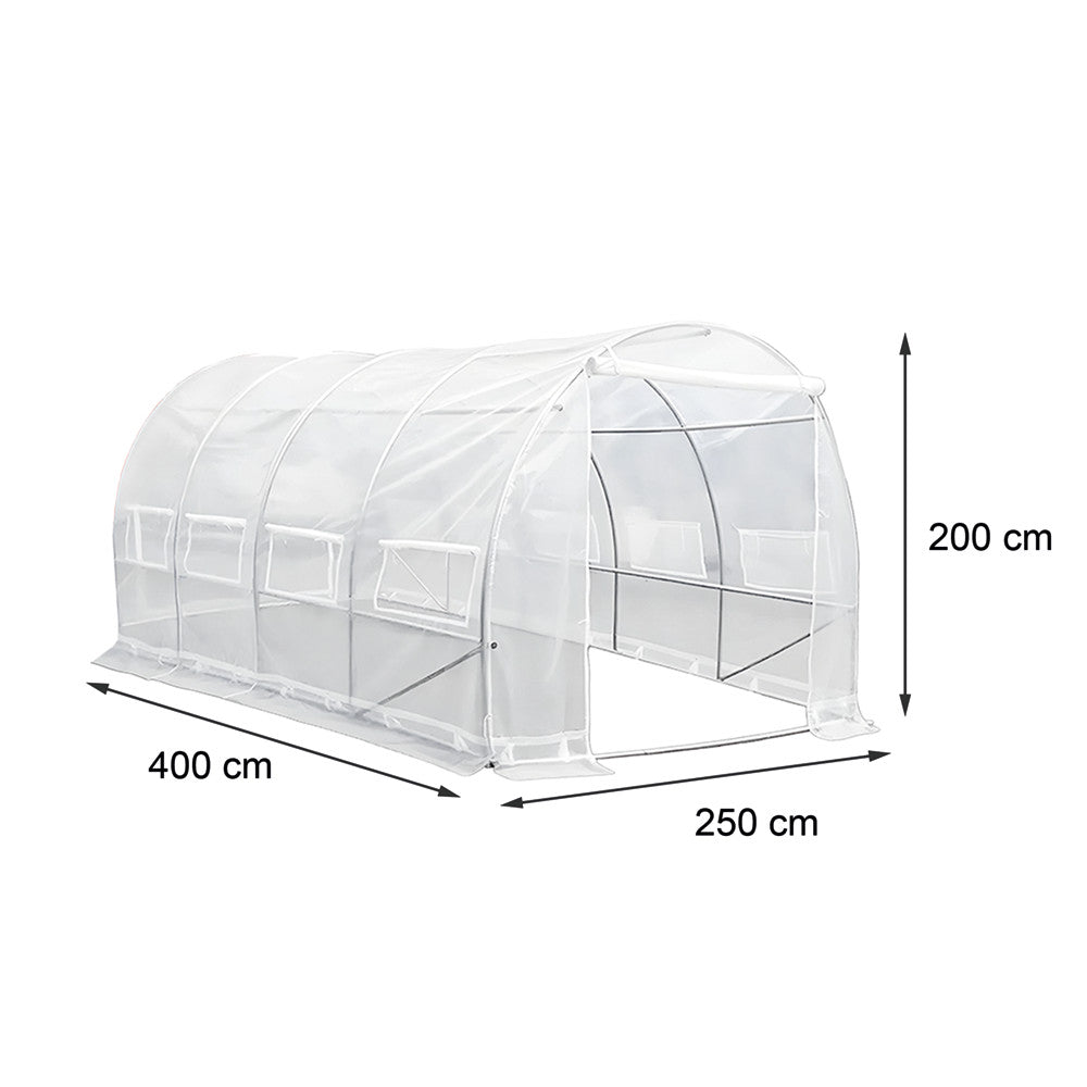 A fóliasátor 200x250x400 cm-es méretének köszönhetően bőséges helyet biztosít a növényeid számára. A termék váz nélkül érkezik, így a fóliát könnyedén rögzítheted bármilyen kompatibilis szerkezetre vagy meglévő vázra. A modern fólia alagút felhúzható ajtóval rendelkezik, ami jelentősen növeli a használat kényelmét. Emellett 8 hálós ablak biztosítja a megfelelő levegő keringést, miközben hatékonyan véd a nem kívánt rovarok ellen. A fóliasátor könnyen telepíthető és karbantartható.
