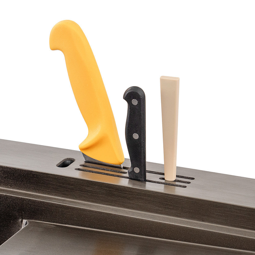 A csurgatófelület segíti az edények száradását, míg a beépített késcsurgató praktikus és biztonságos tárolást kínál az éles eszközöknek.
