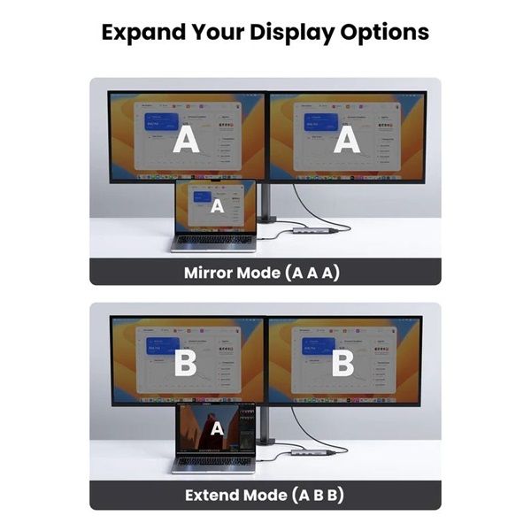 Kétmonitoros bővítés: A 4K HDMI és 1080P VGA port egyidejűleg használható különböző kijelzőkhöz, például monitorhoz, TV-hez vagy projektorhoz. Maximális felbontás: HDMI – 4K 30Hz, VGA – 1080P 60Hz. Támogatja a tükrözött (AAA) és a kiterjesztett (ABB) módot is, Mac és Windows rendszereken egyaránt.