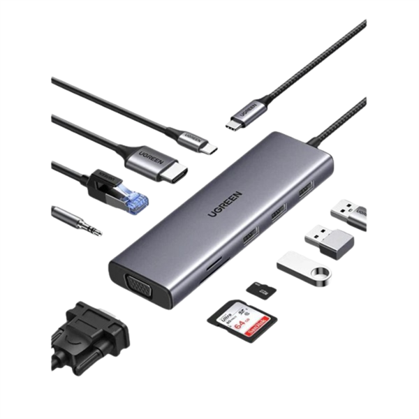 USB-C hub: Az UGREEN 10 az 1-ben USB-C hub a következő csatlakozási lehetőségeket kínálja: 4K HDMI és 1080P VGA kimenet kétmonitoros bővítéshez, gigabites Ethernet port, USB-C 100 W PD gyorstöltőport, 3 db USB-A 3.0 port, 3,5 mm-es jack audio kimenet, valamint SD és TF kártyaolvasó. Az adapter összes portja egyszerre használható.