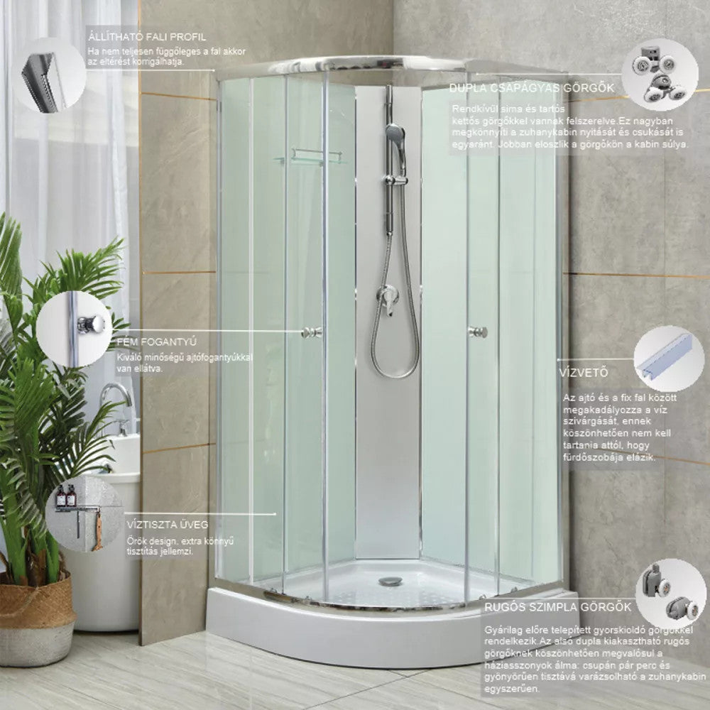 • Típus: íves zuhanykabin zuhanytálcával