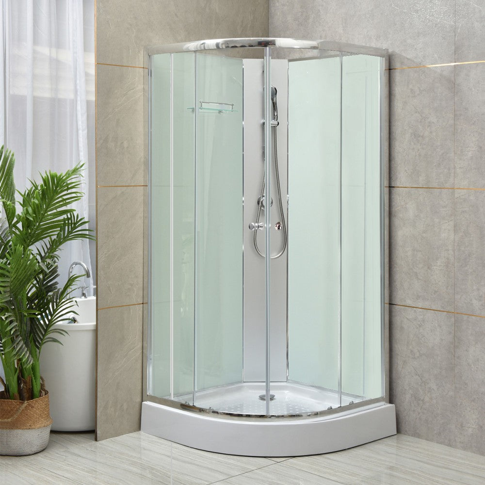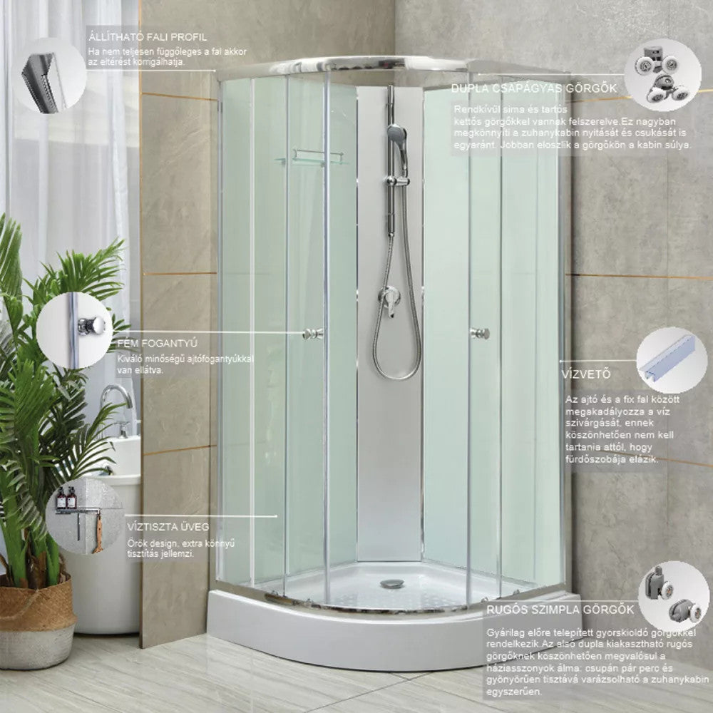 íves zuhanykabin zuhanytálcával és teljes felszereltséggel