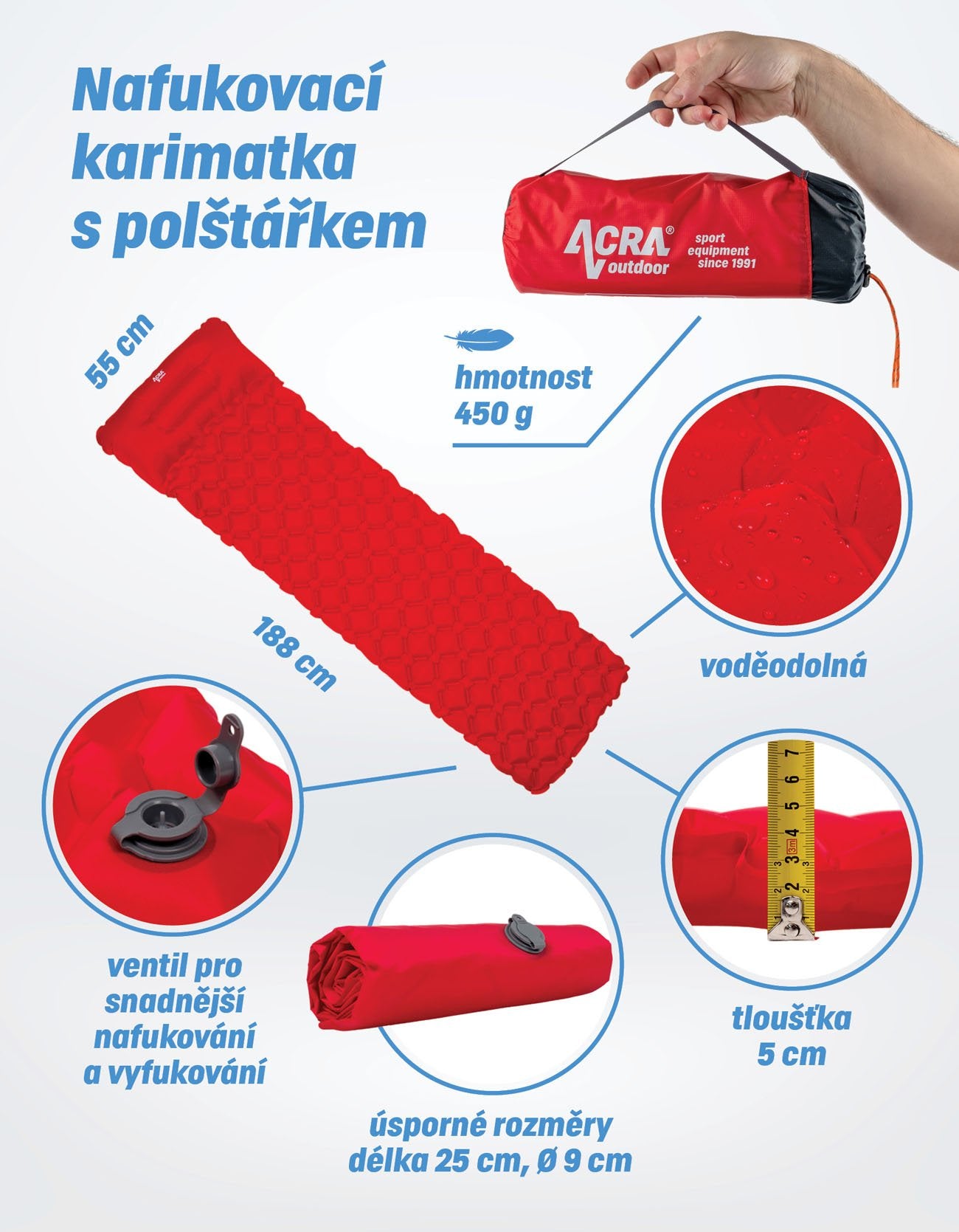 Sátorozol? Készíts egy kényelmes helyet az alváshoz. Acra felfújható matrac párnával kényelmet biztosít neked, miközben a természetben vagy kempingezés közben pihensz. Fújd fel a száddal vagy például az úszómedencékhez használt nagy térfogatú pumpával. A membrán nem engedi ki a levegőt a matrac belsejéből, így könnyebben előkészítheted.