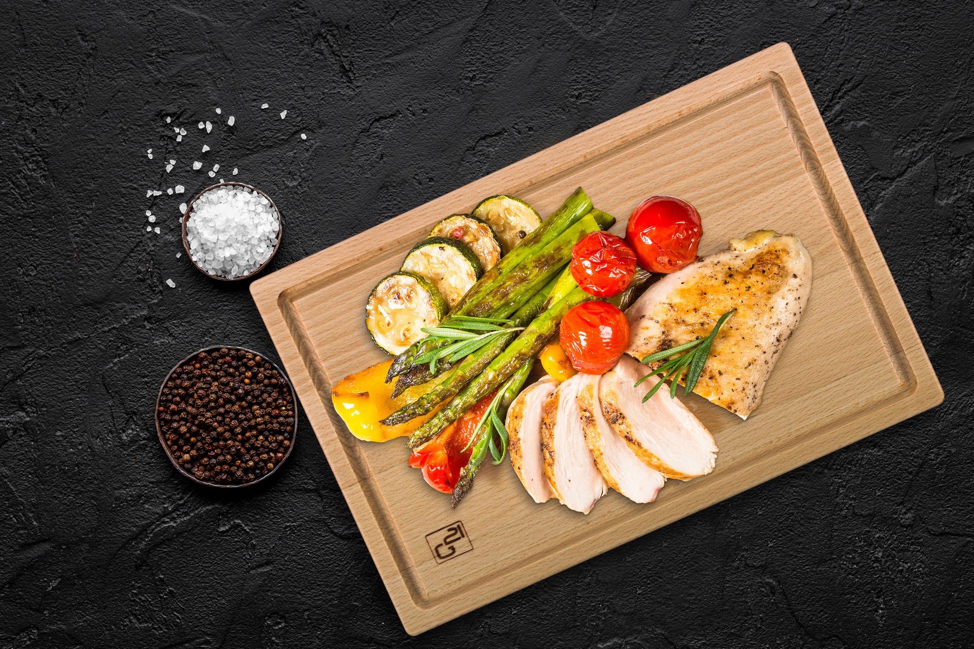 Grillezett finomságok a G21 tálalódeszkán. Csirkemell, spárga és egyéb zöldségek.