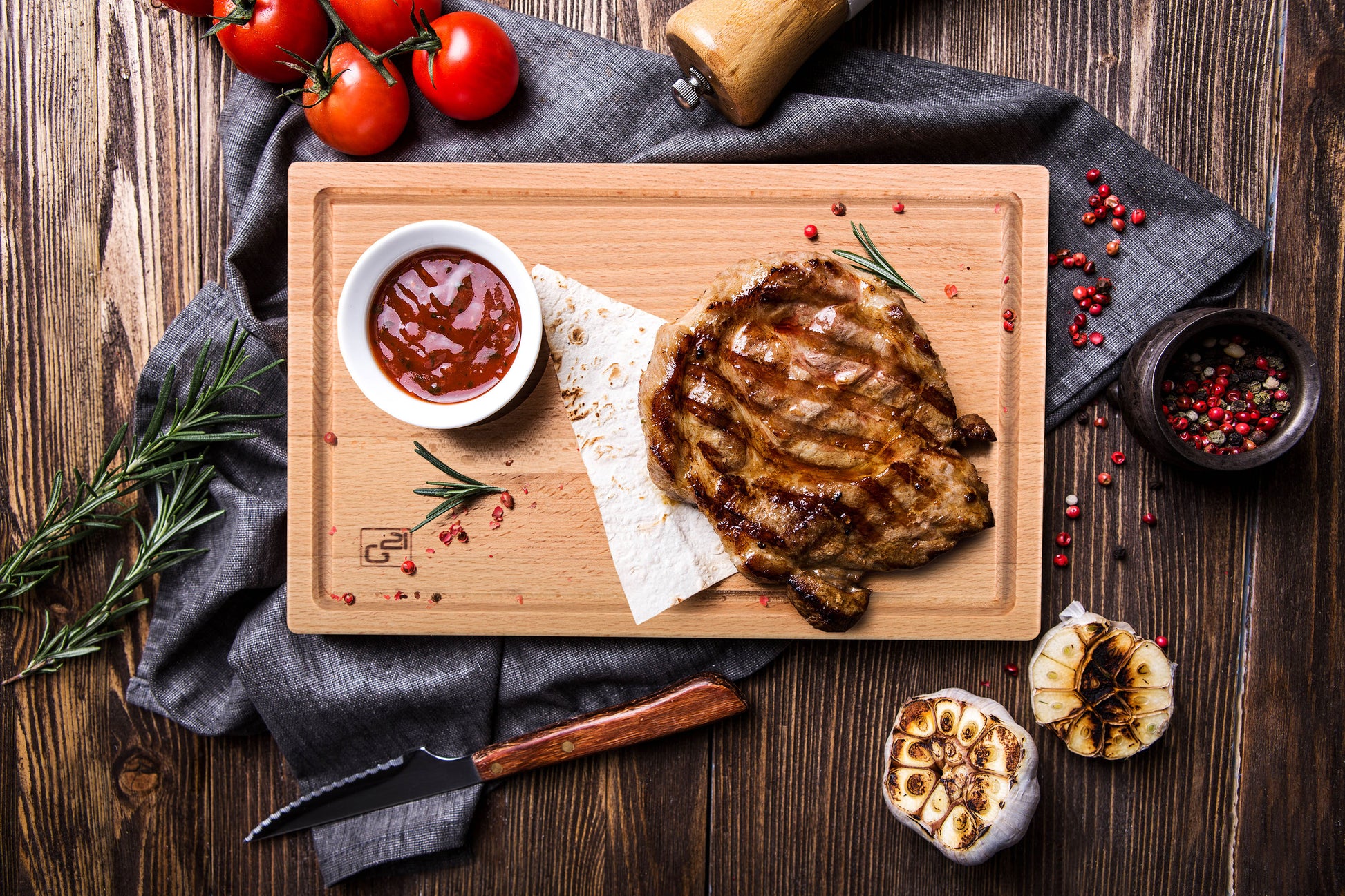 Grillezett steak a G21 tálalódeszkán szósszal a tálban.