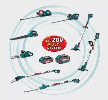 Az akkumulátoros bozótvágó az AKUMULTISYSTEM 20V sorozatba tartozik. A programhoz tartozó összes kerti szerszám és műhelyszerszám ugyanarról az akkumulátorról táplálható.