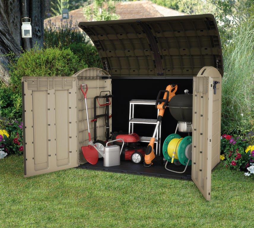 A zárható Keter Store-It-Out Ultra tároló hihetetlen, 2000 l űrtartalommal rendelkezik, így tökéletes tárolóhelyet biztosít szemetesek, kerékpárok,medencetechnika és felszerelés vagy kerti szerszámok számára.A felső burkolat automatikus nyitószerkezettel van ellátva, hidraulikus hengerek segítségével, és egy fém támaszték nyitva tartja a fedelet a szemeteskukák könnyű feltöltése érdekében. A lejtős küszöbnek köszönhetően a tároló készen áll a kerekes konténerek betöltésére is, amelyekkel a legkevesebb gondot sem okoz a tárolás. Ugyanakkor a műhely szerszámainak tárolóhelyeként is szolgálhat, ahol a polcok vízszintesen felszerelhetők a mellékelt konzolok és polcok segítségével.